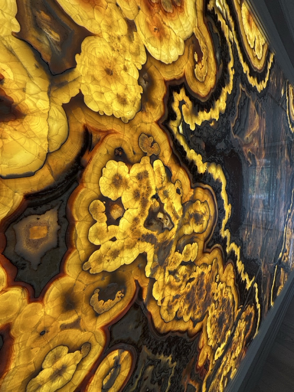Что получил клиент ✨ Визуальный результат: Оникс начал светиться изнутри. Золотистые прожилки и природные формы камня ожили, создавая ощущение, что смотришь в глубину недр земли. Панно превратилось в центральный элемент гостиной — живое, динамичное произведение искусства.