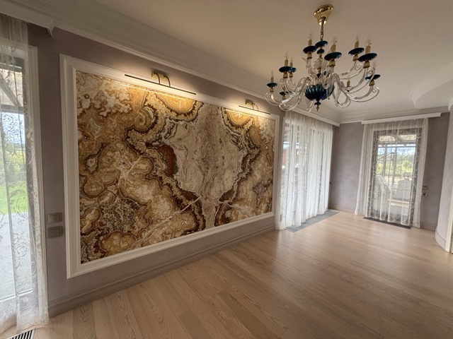 Визуальный результат: Оникс начал светиться изнутри. Золотистые прожилки и природные формы камня ожили, создавая ощущение, что смотришь в глубину недр земли. Панно превратилось в центральный элемент гостиной — живое, динамичное произведение искусства.